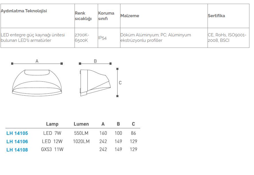 5. Işık difüzyon PC kapağı, anti aging ve UV; Koruma sınıfı IP 54'tür..